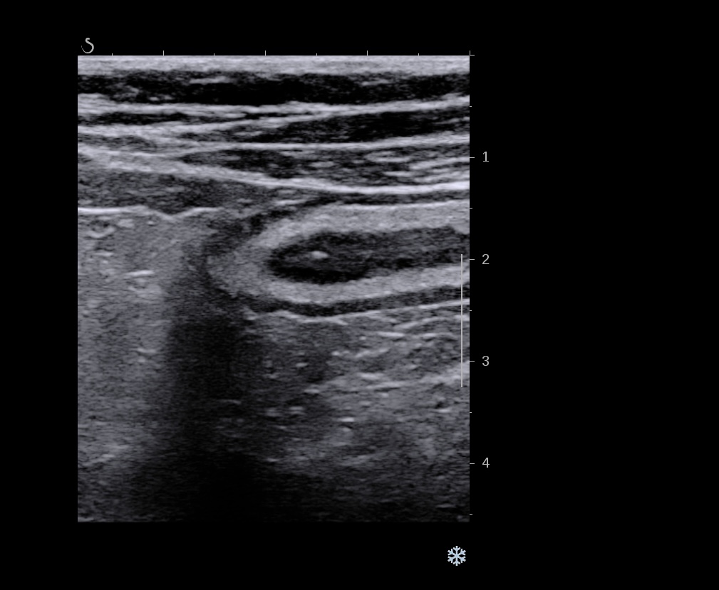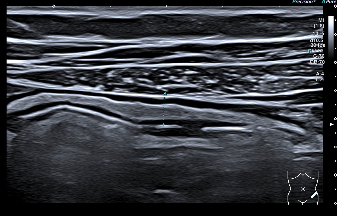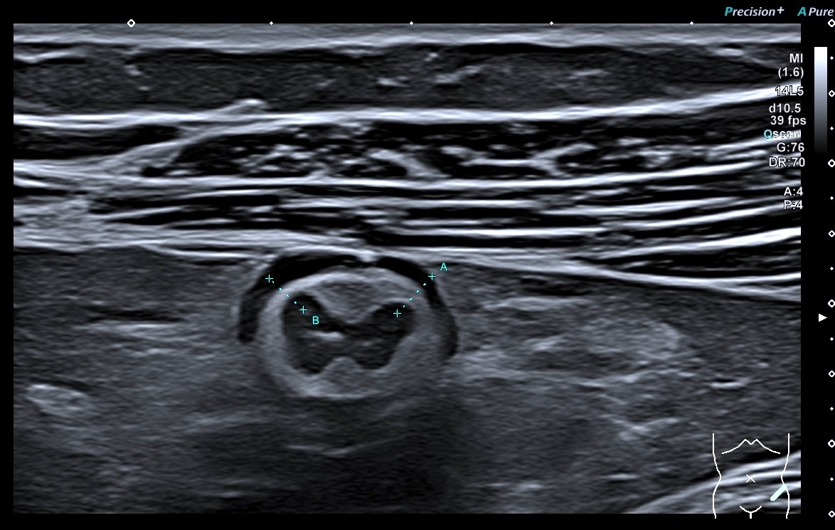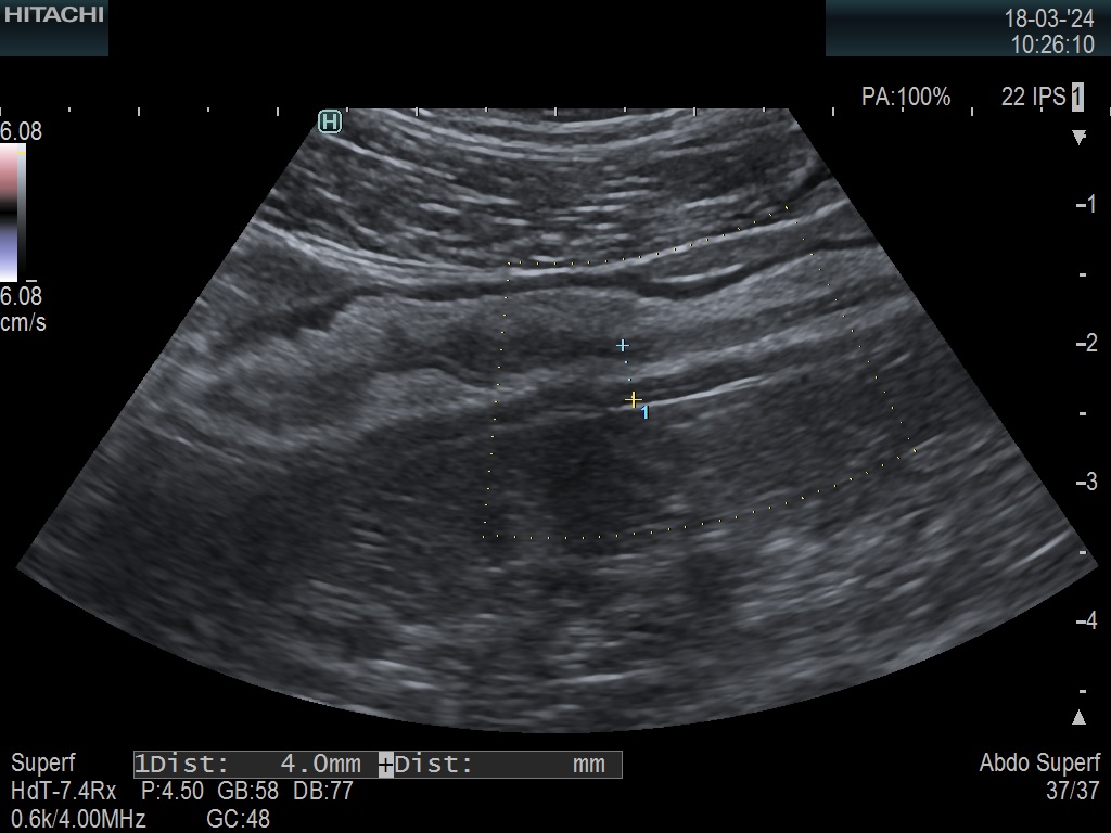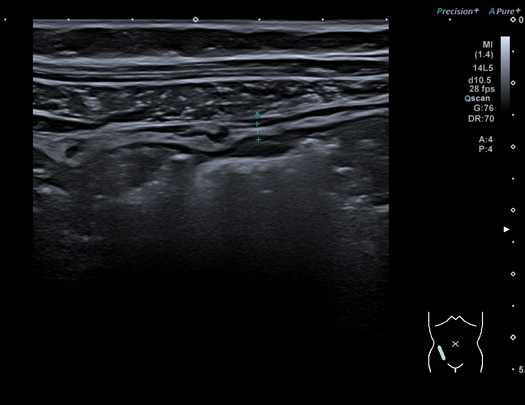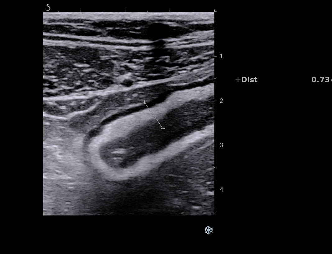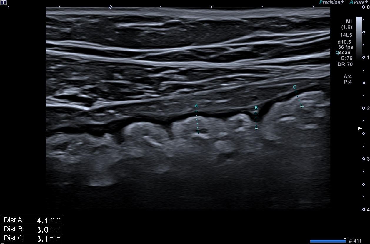 - L’épaisseur est normale ou subnormale ( entre 2,5 et 3,5 mm selon les portions), pas de doppler.