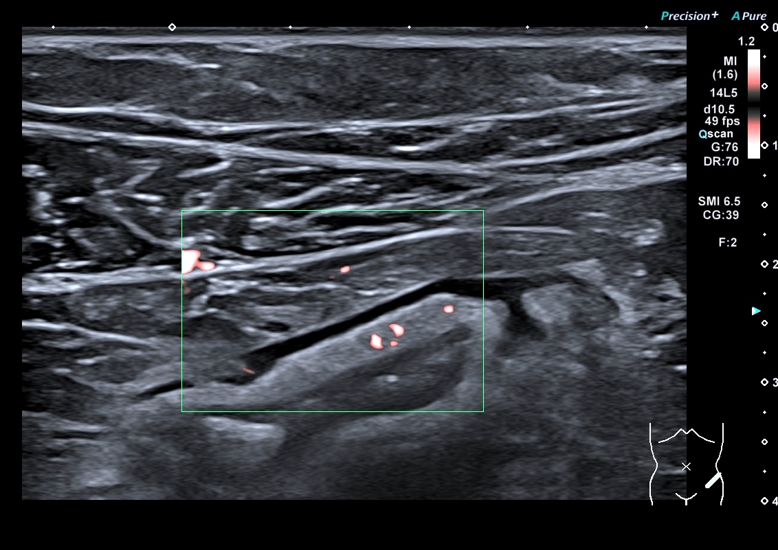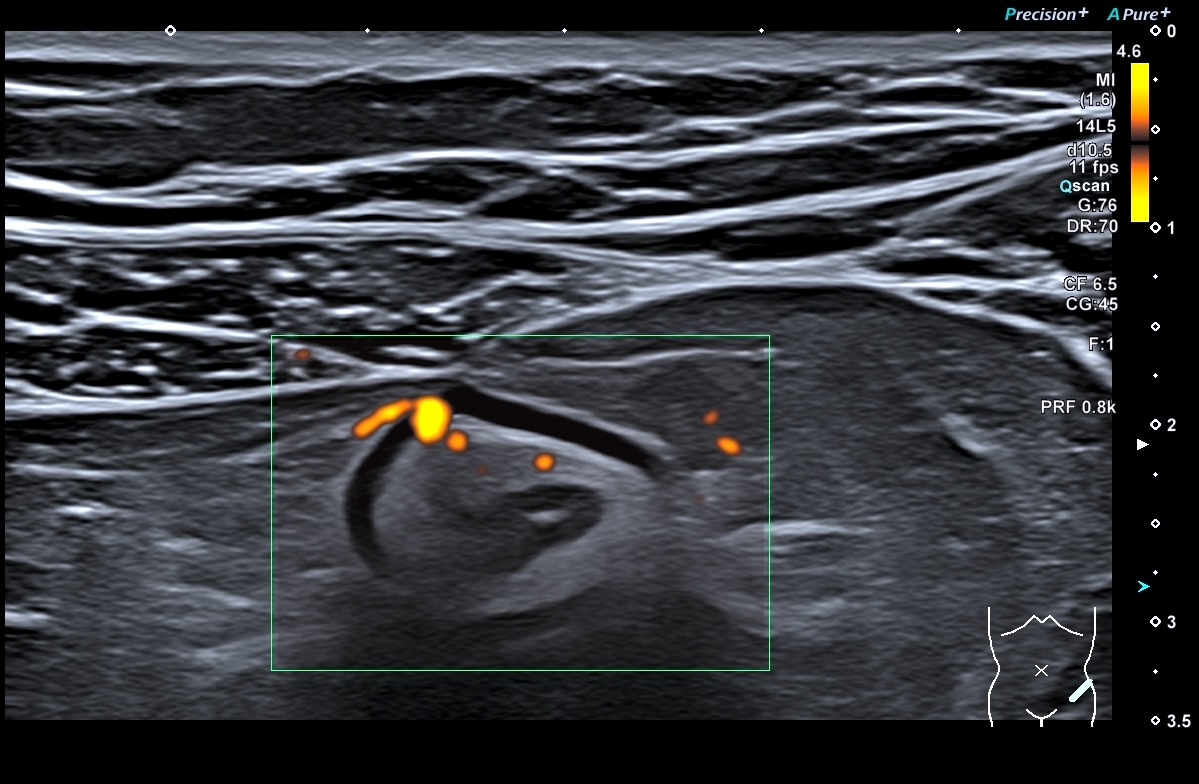 Dans la RCH non compliquée, l’inflammation est superficielle (muqueuse sous muqueuse) donc les signes extra digestifs sont peu marqués (graisse faiblement infiltrée), le doppler est généralement limité à la paroi le score de Limberg est souvent faible (Limberg 0, 1 ou 2). Dans les formes graves l’inflammation gagne l’extérieur de la paroi.
