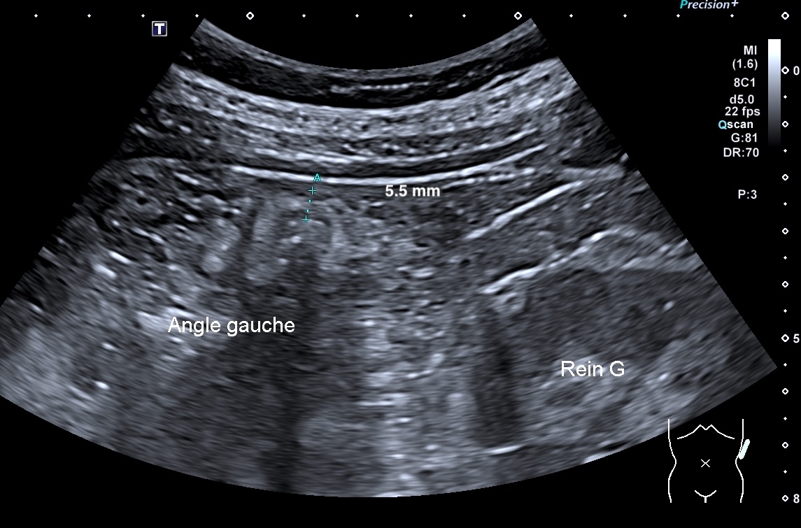 - L’intérêt de montrer plusieurs examens au cours du temps (la qualité des images varie dans le temps) , avec des machines différentes, voir que l’on peut facilement faire le bilan d’extension de la maladie en échographie (ici étendue à l’angle gauche), de voir qu’elle est non compliquée, jamais complètement cicatrisée en échographie.