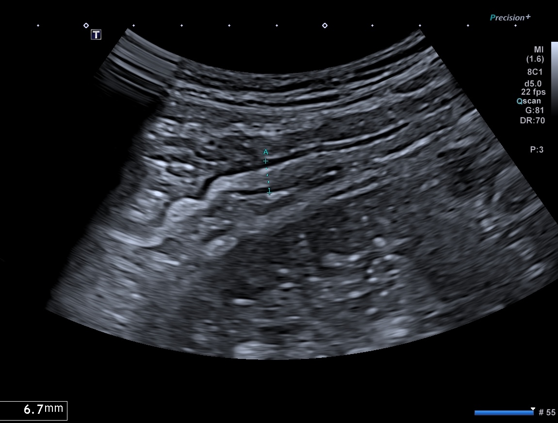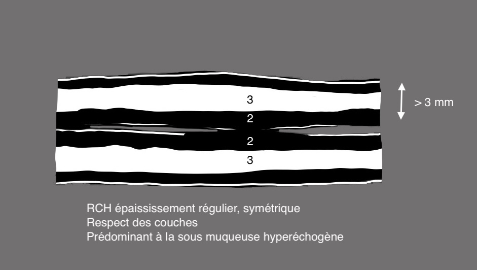 - la structure en couches est respectée (dans les formes non compliquées), et l’épaississement prédomine au niveau de la sous muqueuse (3 ième couche hyperéchogène) qui fait typiquement > 1/3 de l’épaisseur de la paroi.