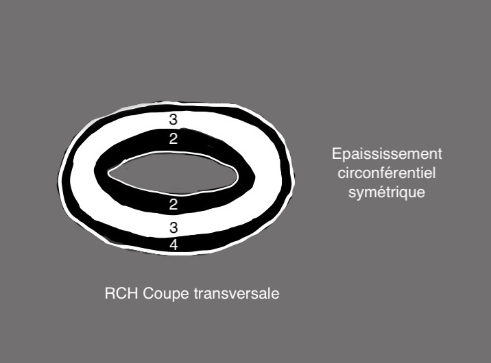 - Atteinte symétrique en CL (même épaississement des parois antérieure et postérieure)