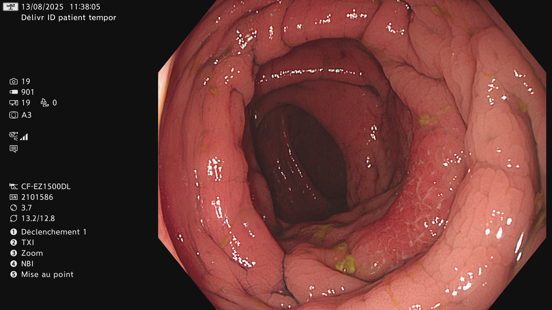 La vidéo est d’abord en basse fréquence, en partant de l’angle droit puis dans un second temps en partant du rectum. Enfin examen de la paroi du sigmoïde avec la sonde haute fréquence.