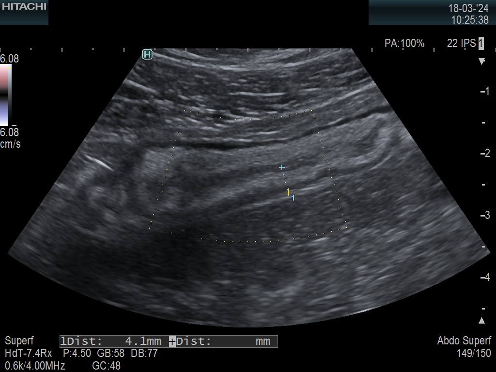 Il est difficile en échographie d’affirmer une cicatrisation rectale (d’où l’intérêt de la coupler à la calprotectine fécale). La réalisation d’une échographie transpérinéale peut compenser ce défaut de l’échographie abdominale et permettre d’évaluer le rectum.
