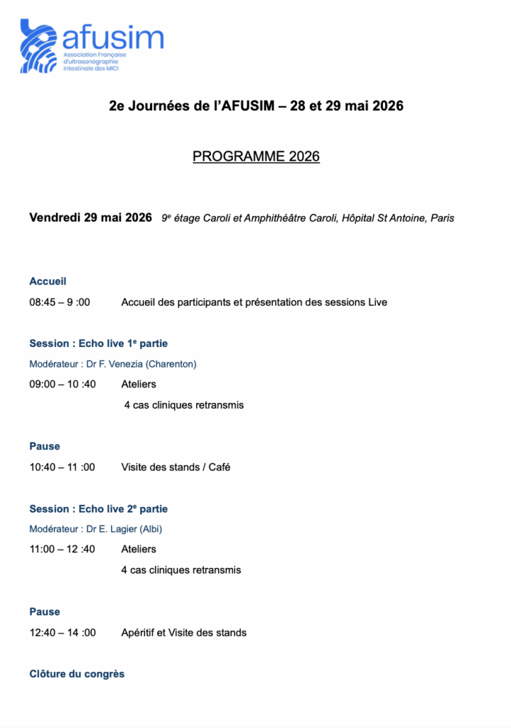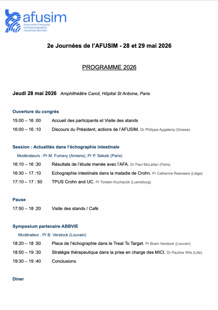 Les Journées de l’AFUSIM 2026 réunissent des gastroentérologues français et européens expérimentés et engagés dans le diagnostic et le suivi des MICI par l’échographie intestinale.