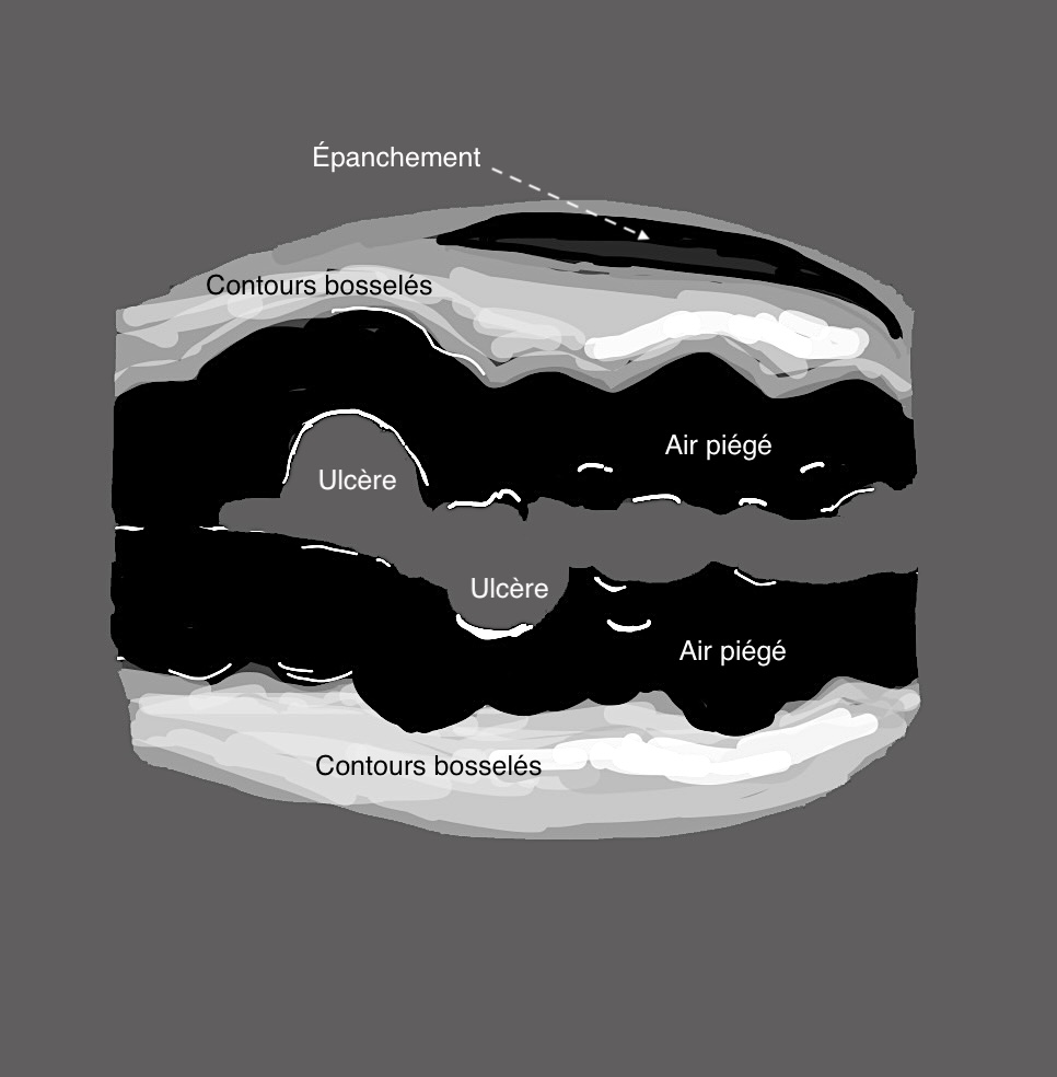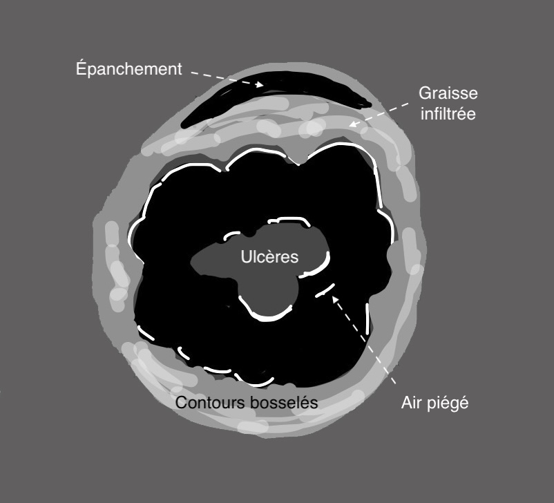 La paroi du colon devient totalement déformée, en surface avec ulcères, en périphérie avec des bords externes irréguliers, la graisse est infiltrée, voire apparition d’un épanchement liquidien, signe de gravité extrême