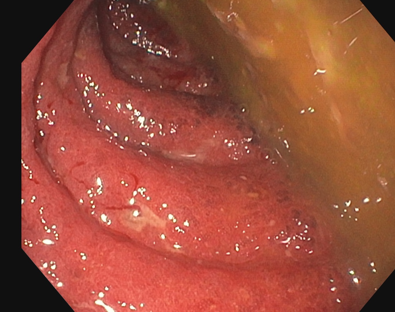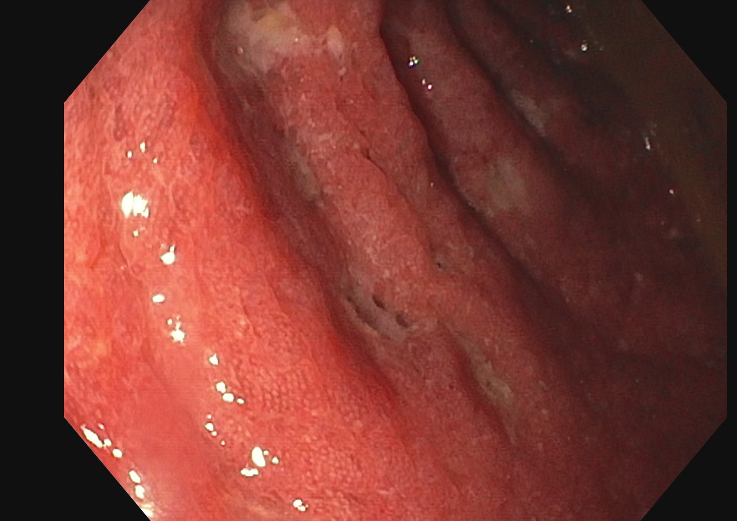 Si l’inflammation s’aggrave, on peut voir des ulcères creusants en surface et la limite externe de l’anse (classiquement rectiligne dans la RCH) devient irrégulier, bosselé.