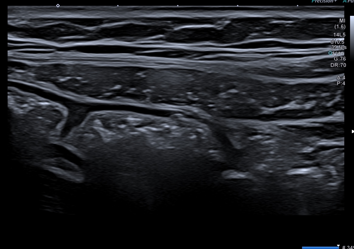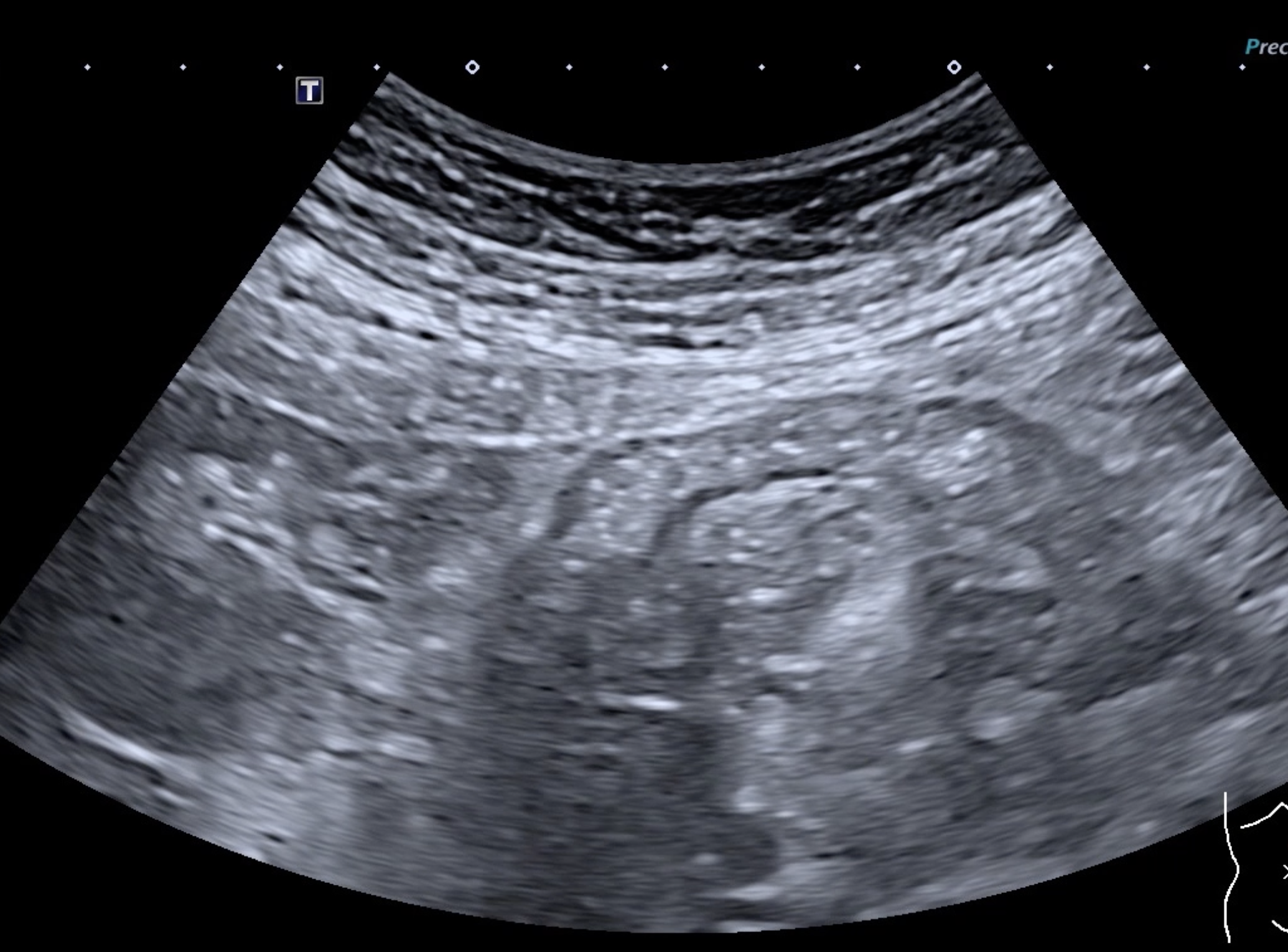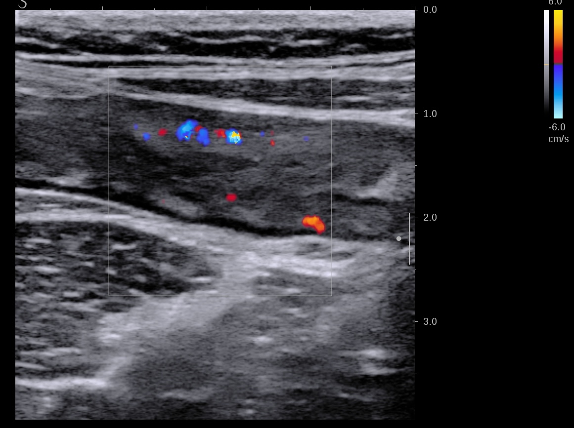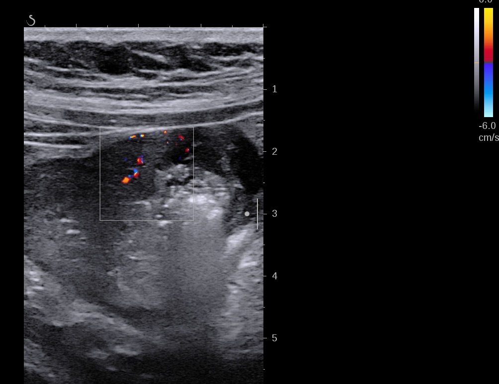 Là encore la paroi est très hypoéchogène, la structure en couches est par endroit totalement absente, ulcérations en surface, infiltration de la graisse, doppler intense, petites adénopathies périphériques.