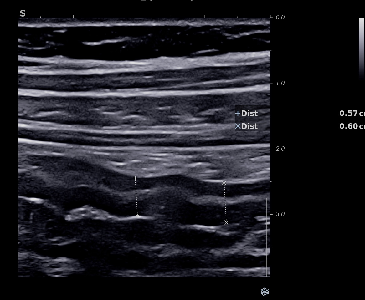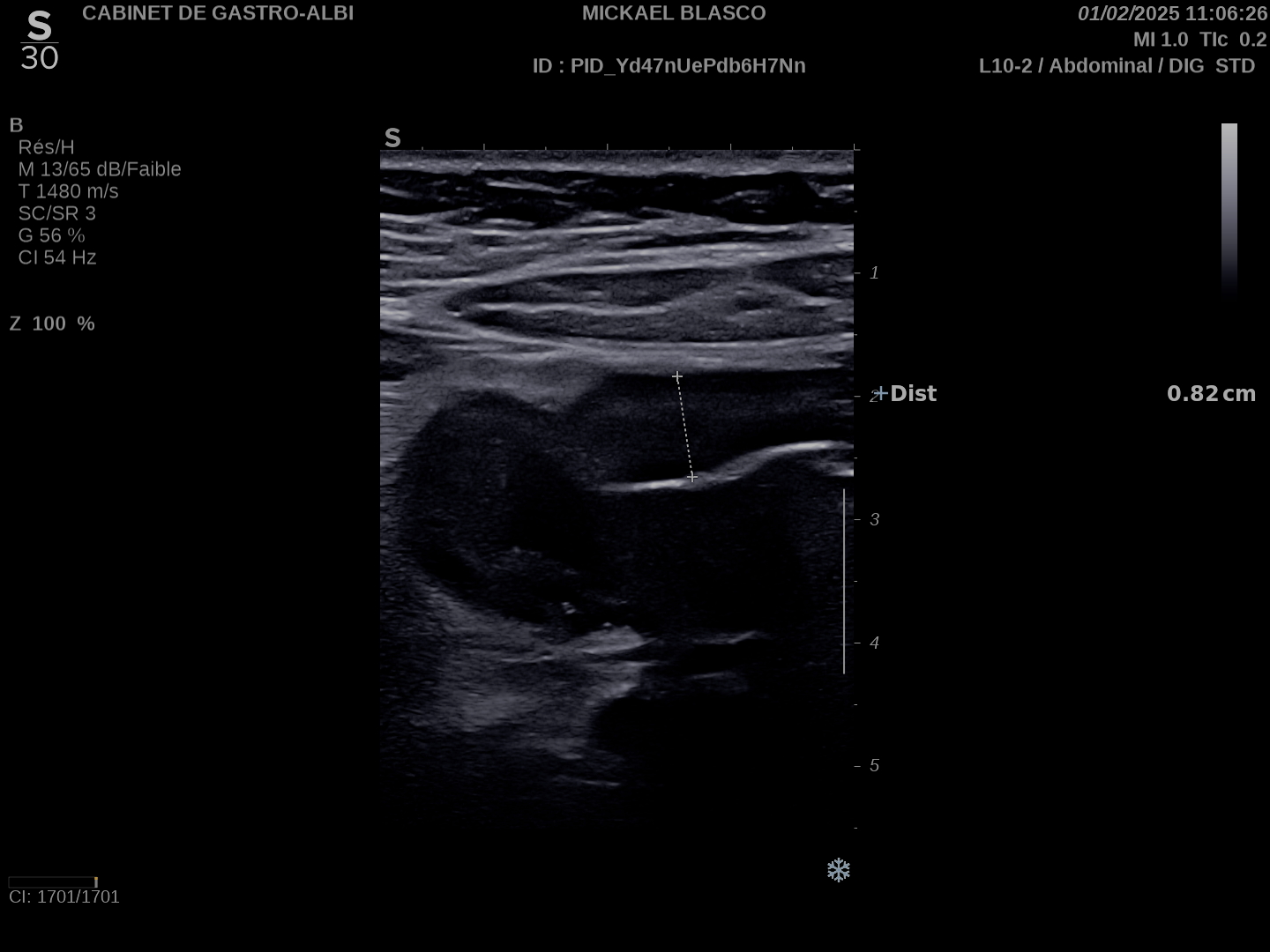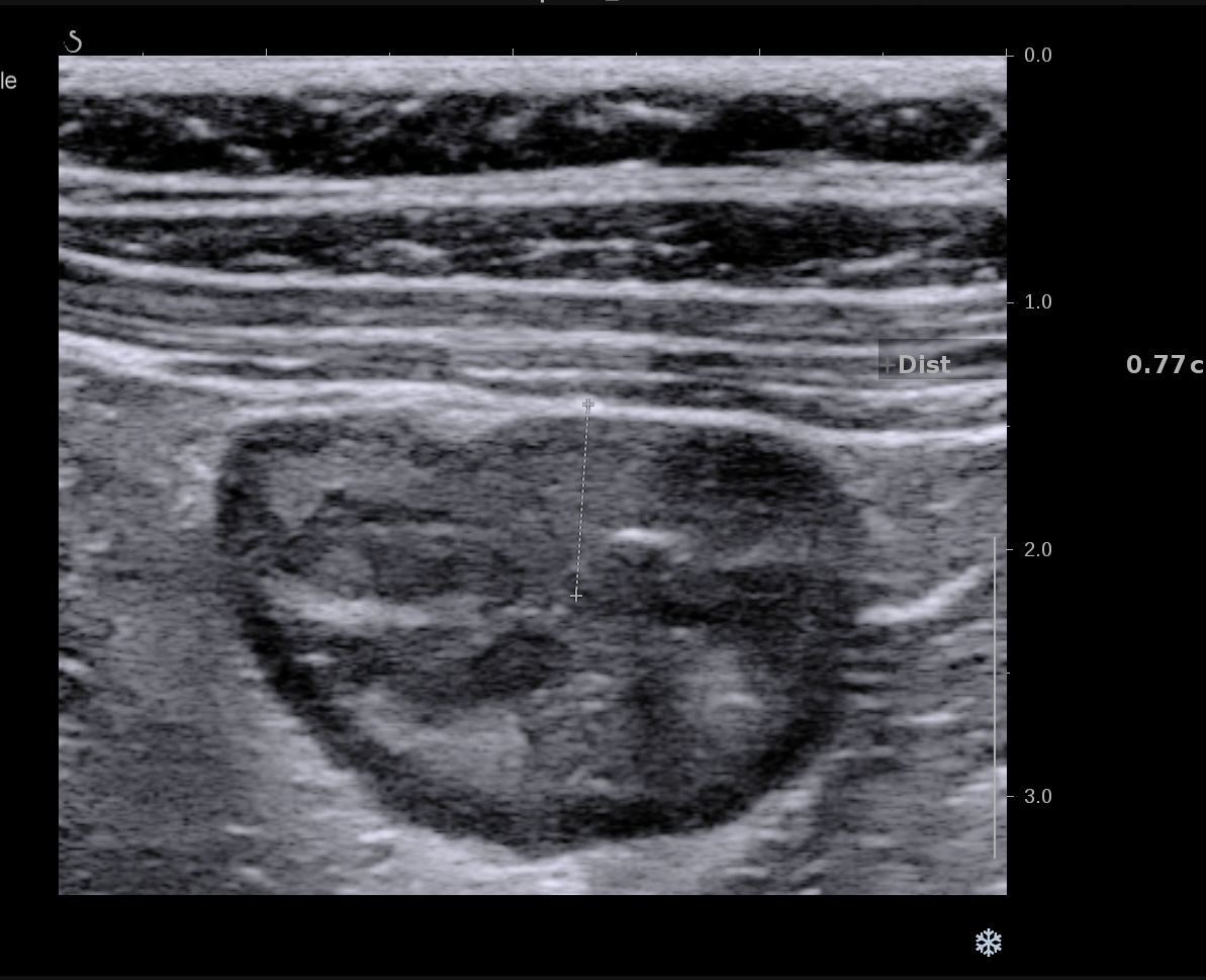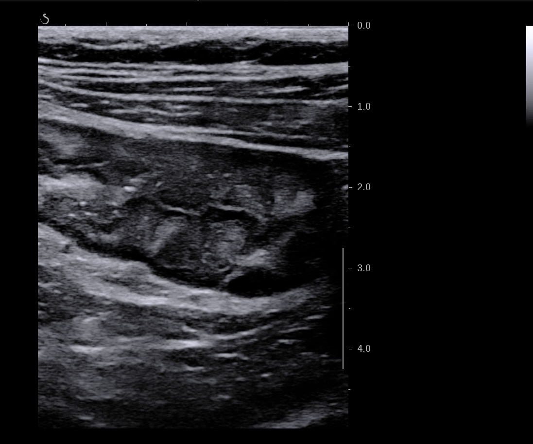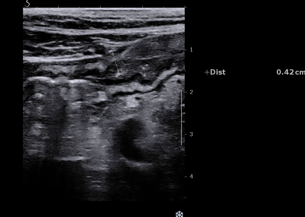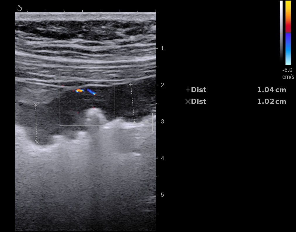 Patiente revue 4 ans plus tard sous vedolizumab Entiyo® en rémission clinique complète, biologie et calprotectine fécale normales, l’échographie (mauvaise échogénicité de la patiente) montre une paroi normalisée entre 1,8 et 2,8 mm d’épaisseur structure en couche conservée.