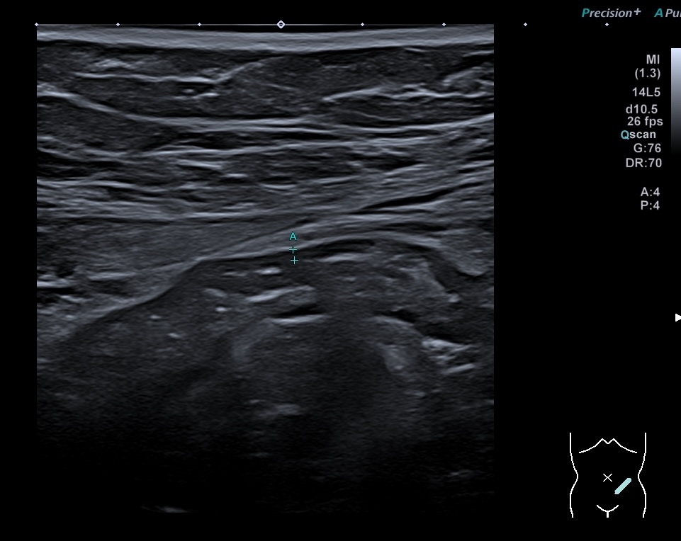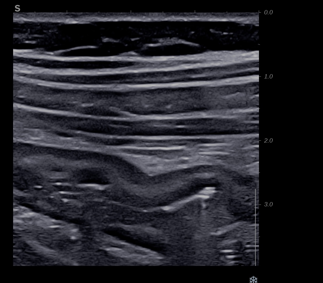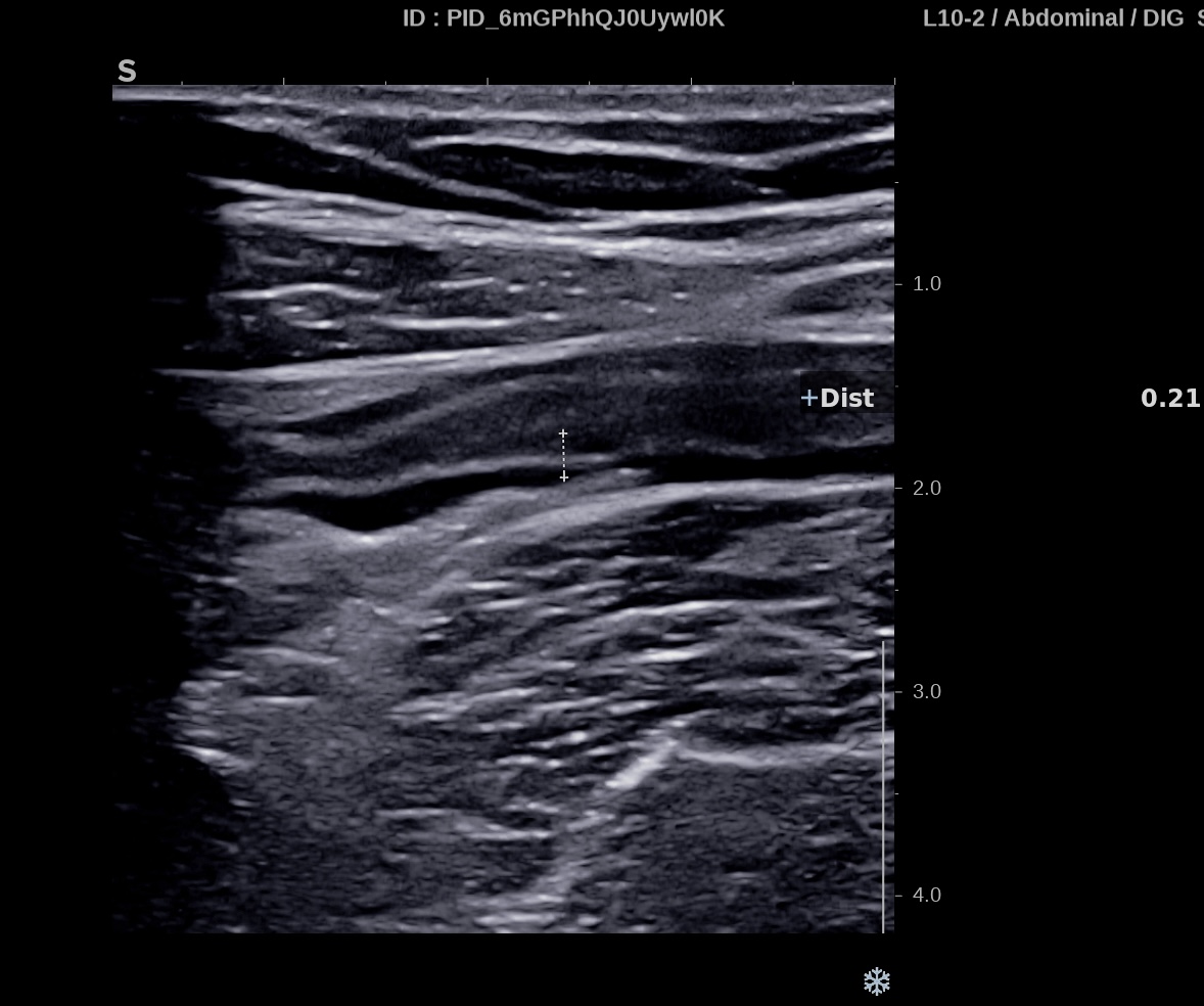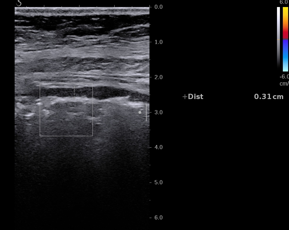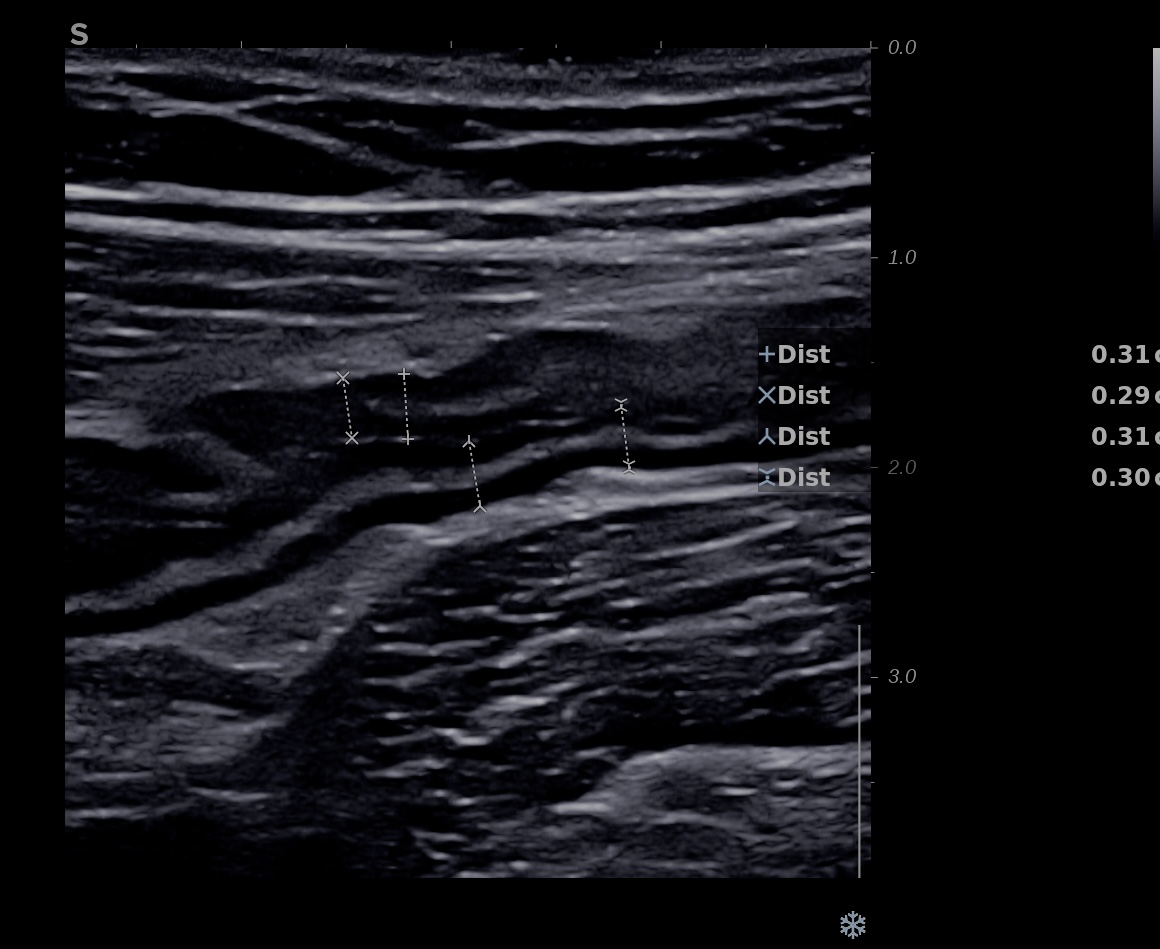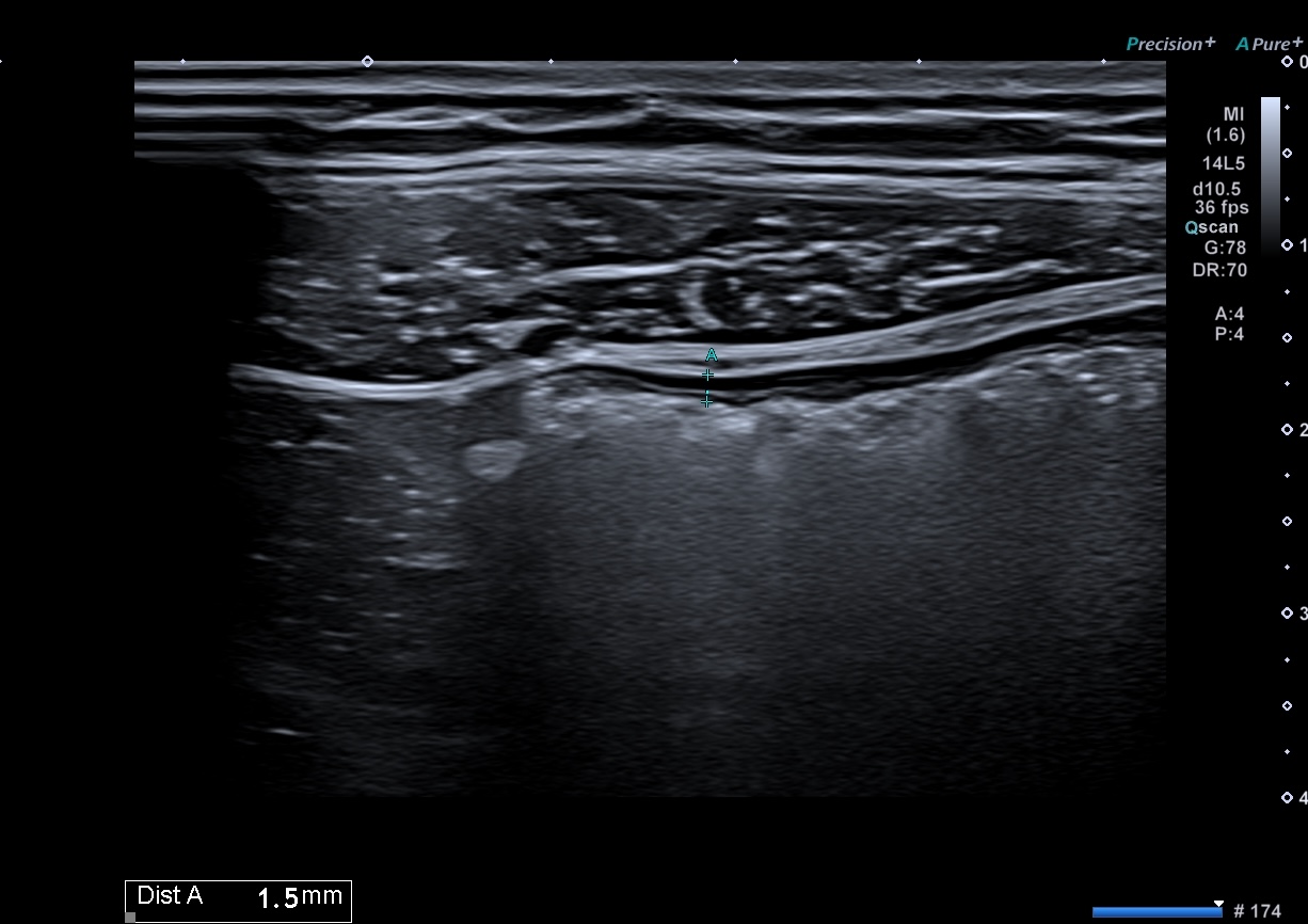 Patiente revue 4 ans plus tard sous vedolizumab Entiyo® en rémission clinique complète, biologie et calprotectine fécale normales, l’échographie (mauvaise échogénicité de la patiente) montre une paroi normalisée entre 1,8 et 2,8 mm d’épaisseur structure en couche conservée.