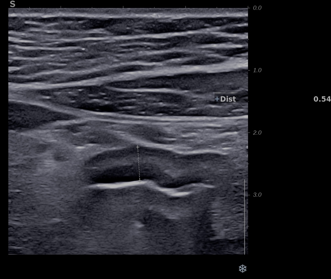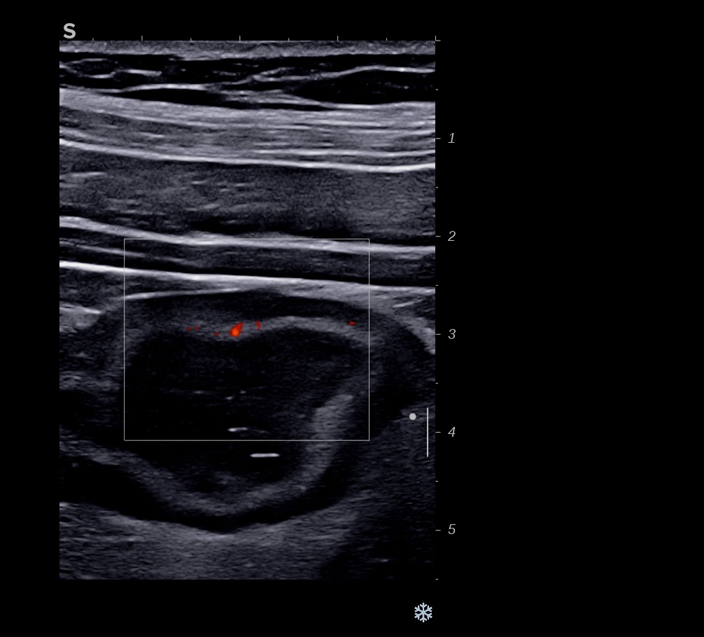 Dès J7 l’amélioration échographique de la paroi se poursuit. L’épaisseur pariétale approche la normale (3 mm) et par endroit 2,1 mm, les couches sont bien visibles, le doppler reste intense (Limberg 3) .