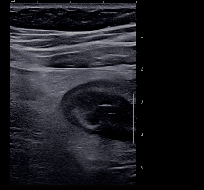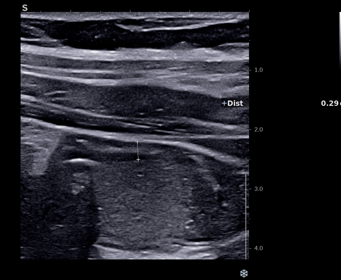 Nouvelle échographie à J15, La paroi est moins épaisse mais la structure en couche n’est pas totalement réapparue, le score de Milan MUC est alors à 6,2