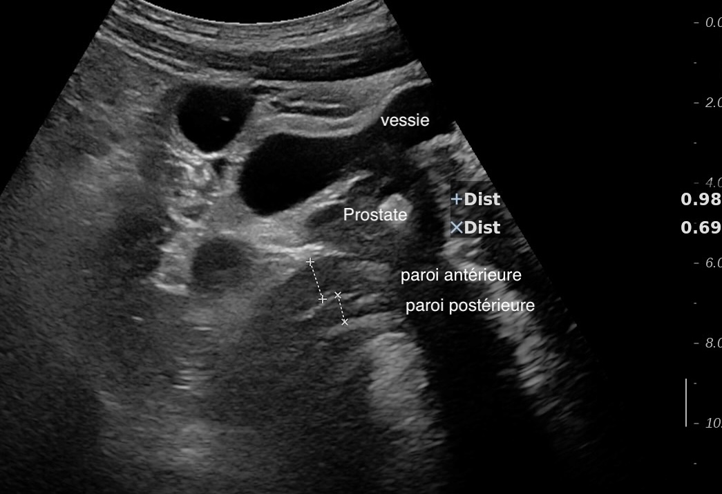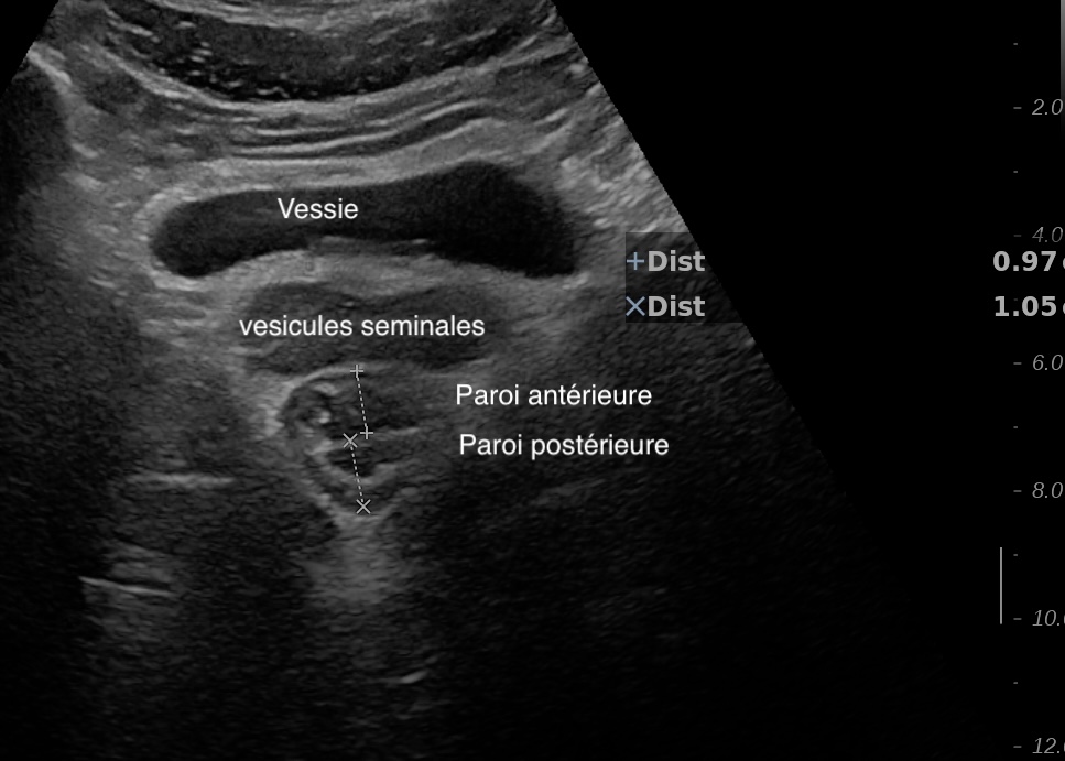 Le rectum est bien vu avec la sonde basse fréquence la paroi atteint 10 mm à ce niveau.