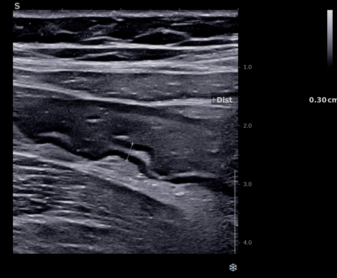 Epaississement entre 4.5 et 7 mm selon les segment, la structure en couche disparait totalement par endroit, à d’autre elle est partiellement conservée. Activité doppler intense de la paroi